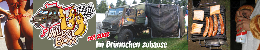 Home Hallo werter Besucher unserer Webpräsenz, wir, die Wurstboys, besuchen seit 2002 das 24-Stunden-Rennen am Nürburgring. Wir machen die lange Reise aus dem schönen Witten mitten im Ruhrgebiet zum Nürburgring, um dort eines der schönsten Termine im Jahr wahrnehmen zu können. Wir reisen im Mercedes UNIMOG 404 Bj. 65 an. Unser Standplatz ist oberhalb des Brünnchens. Wir sind kaum zu übersehen mit unserem Wagen. Wenn man von der Hohen 8 zum Brünnchen wandert, läuft man zwangsläufig durch unser Wohnzimmer. Auf den folgenden Seiten wollen wir einen kleinen Einblick geben wie wie dort so "leben". Viel Spass